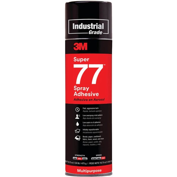 3M Super 77 Multipurpose Spray Adhesive is an extremely versatile, fast-drying, and transparent spray adhesive that bonds a wide range of lightweight materials - Fast, permanent bond provides fast results to keep projects moving ahead