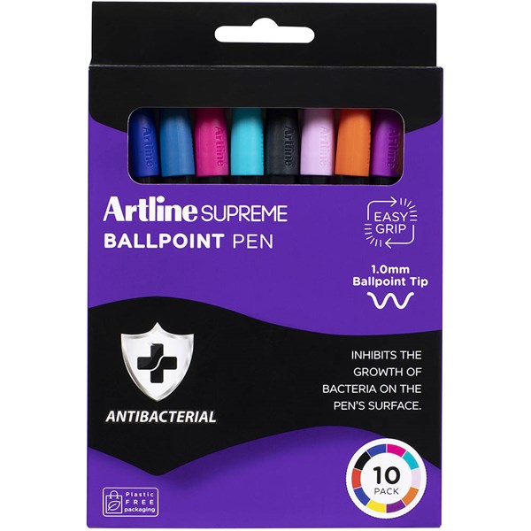 ARTLINE SUPREME ANTIMICROBIAL BALLPOINT PEN 1.0MM ASSORTED BRIGHTS PACK 10