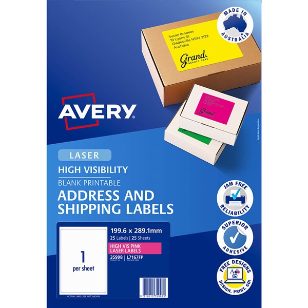 AVERY 35998 L7167FP HIGH VISIBILITY SHIPPING LABEL LASER 1UP FLUORO PINK PACK 25