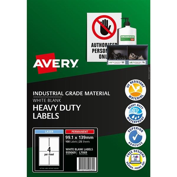 AVERY 959069 L7069 HEAVY DUTY LASER LABELS 4UP WHITE PACK 25