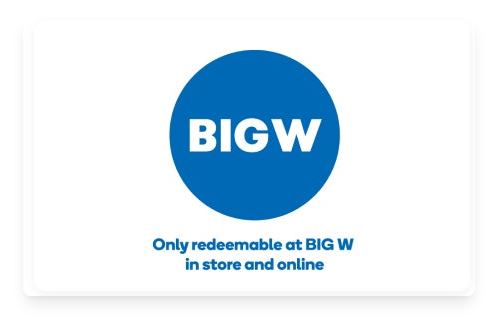 BIG W Gift Cards give your giftee the gift of shopping choice with thousands of great quality products Australia wide. Big W Gift cards can only be used at Big W stores nationally. - The Big W Gift Card can be used to purchase the latest in fashion, toys, linen, baby clothes, furnishings and more for parents and children alike, BIG W has everything the Australian family needs.