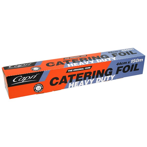 The CAPRI Heavy Duty Aluminium Foil in Dispenser is designed for superior strength and performance - Measuring 440mm x 150m, this durable silver foil is ideal for demanding kitchen tasks such as roasting, grilling, and food storage