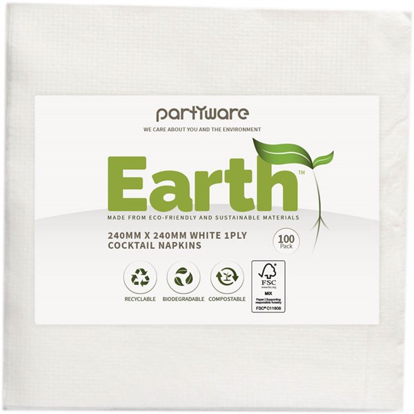 Earth Eco cocktail napkins are great for your next party, function or event - They are white, soft and 1 ply and come in an economical pack of 100 for your next big occasion