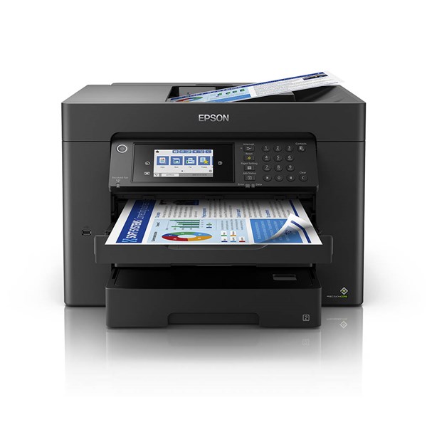 The WorkForce WF-7845, powered by PrecisionCore Heat-Free Technology, delivers Performance and Efficiency for small and home offices - Powered by PrecisionCore Heat-Free Technology the WorkForce WF-7845 all-in-one printer quickly produces high quality prints up to A3+ (13 x 19inch) and scans up to A3 (11 x 17inch). A versatile inkjet, it features a 550-sheet capacity, dual trays, plus a rear feed for specialty paper, ensuring added productivity for any office. It also includes auto 2-sided print, copy, scan and fax, plus a 50-page Auto Document Feeder. Use the 4.3 inch colour touchscreen for easy navigation and control. Featuring the ultimate in wired and wireless networking, the WF-7845 makes it easy to print from tablets and smartphones, and includes Wi-Fi Direct and Ethernet