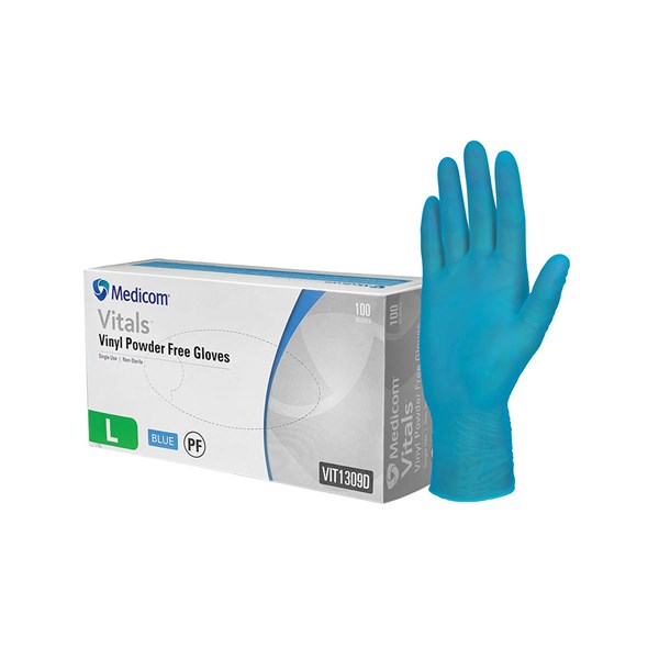 MEDICOM VITALS VINYL POWDER FREE GLOVES BLUE MEDIUM PACK 100