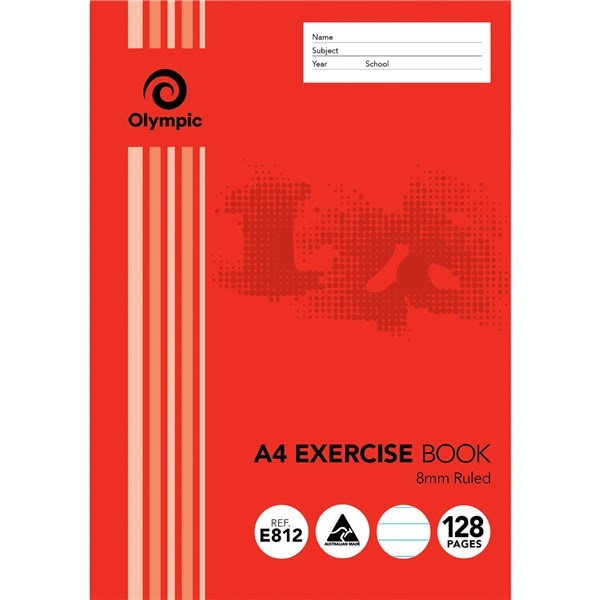 OLYMPIC E812 EXERCISE BOOK 8MM RULED 55GSM 128 PAGE A4 RED