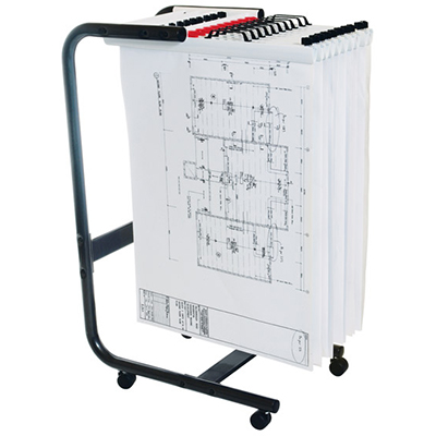 The Planhorse trolley occupies a very small space whilst storing up to 1000 drawings, plans or large sheets - Sheets are grouped together in a clamp which hangs on the trolley