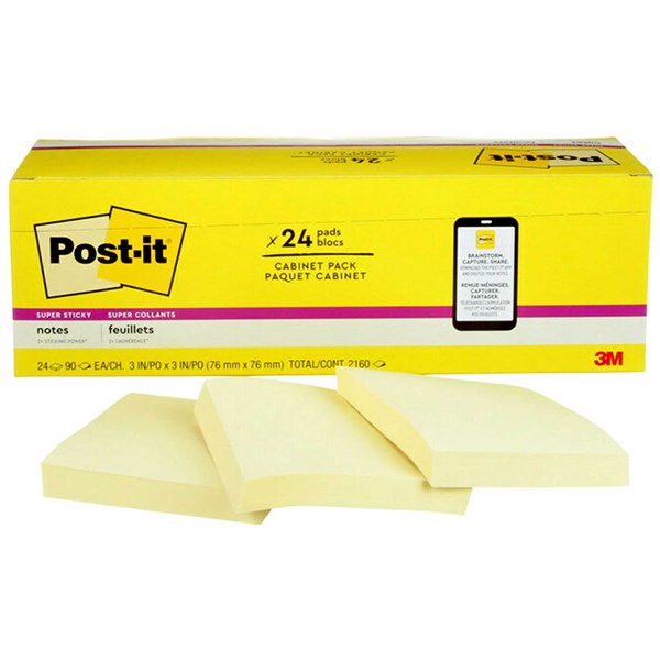 POST-IT 654-24SSCP SUPER STICKY RECYCLED NOTES 76 X 76MM CANARY YELLOW CABINET PACK 24