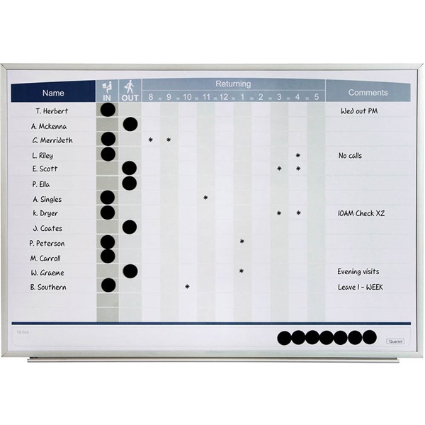 - Keep track of your employees with the Quartet dry erase magnetic In/Out boards