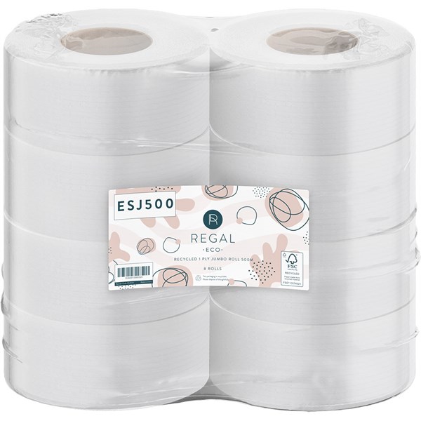 REGAL ECO RECYCLED JUMBO TOILET ROLL 1-PLY 500M WHITE CARTON 8