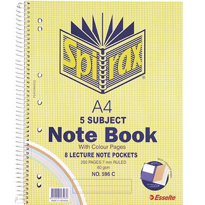 SPIRAX 596C 5-SUBJECT NOTEBOOK 7MM RULED SPIRAL BOUND COLOURED PAPER 250 PAGE A4