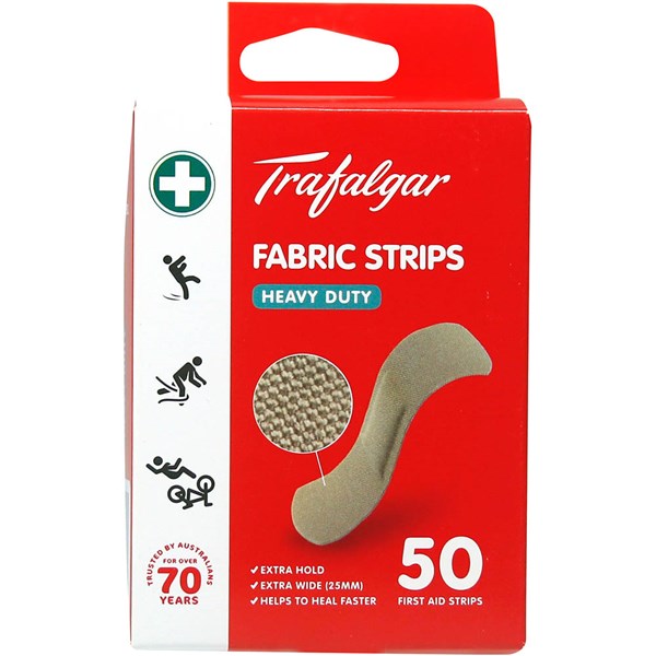 Trafalgar's Premium Fabric Strips contains a protective non-stick wound pad that seals all around, to protect and heal cuts, scratches and abrasions - Premium Fabric Strips come in a box of 50; all are extra wide offering 25mm coverage and have been manufactured with an extra hold adhesive, allowing to be removed when required