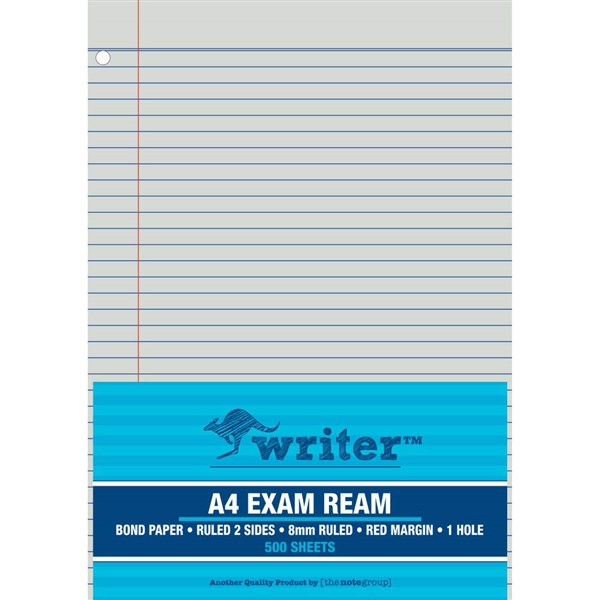 WRITER EXAM PAPER 60GSM 8MM RULED 1 HOLE PUNCHED A4 WHITE 500 SHEETS