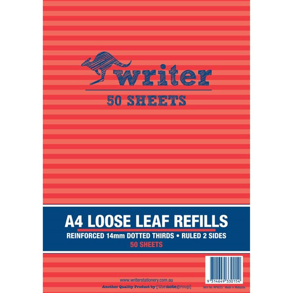 WRITER LOOSE LEAF REFILL REINFORCED 14MM DOTTED THIRDS 60GSM A4 50 SHEET