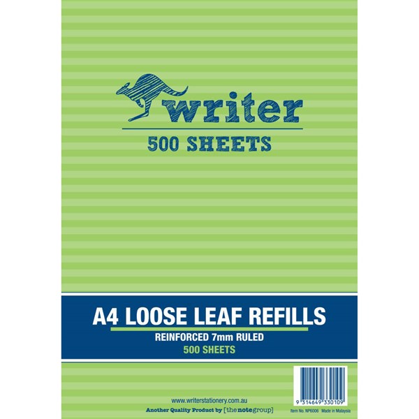 WRITER LOOSE LEAF REFILL REINFORCED 7MM RULED 60GSM A4 500 SHEET